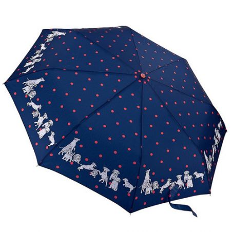 Petit parapluie pliant avec un motif de chiens de la marque anglaise Fulton sur un joli fond en bleu marine agrémenté de pois rouges..